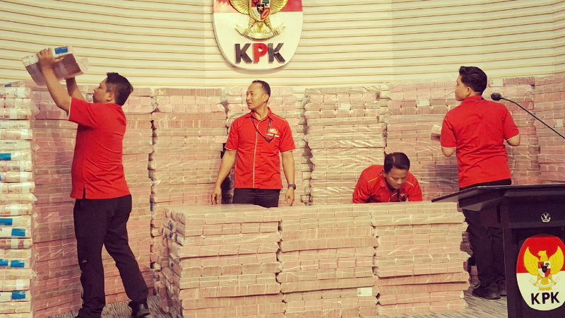 Dalam jumpa pers ini, KPK memamerkan uang Rp 300 miliar yang merupakan bagian dari lebih dari Rp 883 miliar uang rampasan dari Ekiawan Heri Primaryanto.