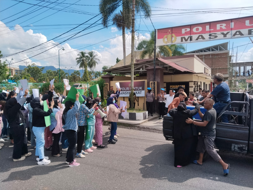 Dalam orasinya, koordinator lapangan Didi Musa menyampaikan enam poin tuntutan kepada pihak kepolisian. Ia menegaskan bahwa penetapan tersangka terhadap dokter spesialis kandungan dan kebidanan itu dinilai janggal dan perlu dikaji secara terbuka. Massa juga meminta proses hukum berjalan secara transparan dan adil.